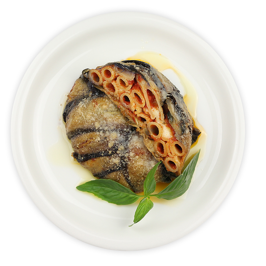 トマトソースとペンネ、水牛のモッツァレッラ、バジルを揚げナスで包んだパスタ料理です。丸ごとオーブンでこんがり焼き上げると水牛のモッツァレッラがとろけてパスタと絡みとってもブォーノ!!イタリアでは週末マンマが家族のために作る料理の一品です。
